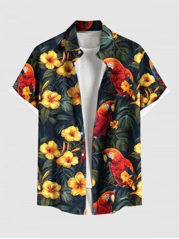 Plus Size Tropical Leaf Hibiscus Flower Parrot Print Hawaii Button Pocket Shirt For Men - Black - Xl