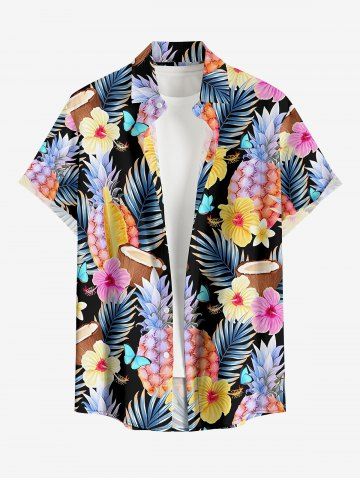 Plus Size Tropical Leaf Hibiscus Flower Pineapple Coconut Print Hawaii Button Pocket Shirt For Men - Multi - S