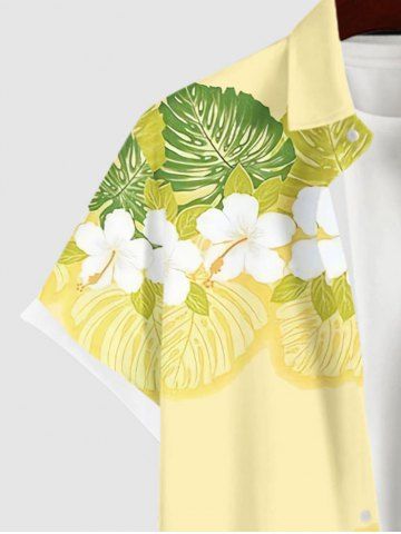 Plus Size Tropical Leaf Hibiscus Flower Print Buttons Pocket Hawaii Shirt For Men - Yellow - 2xl