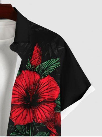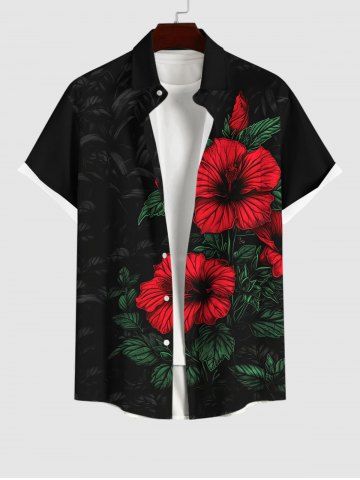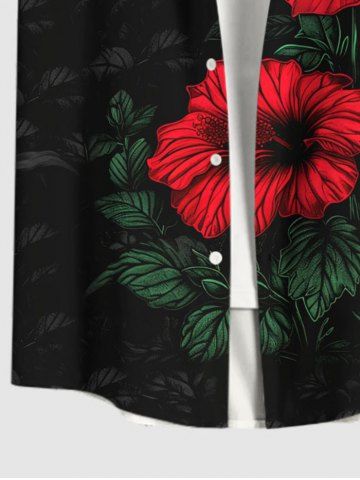 Plus Size Tropical Leaf Hibiscus Flower Print Buttons Pocket Hawaii Shirt For Men - Black - 3xl