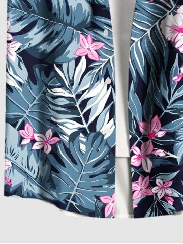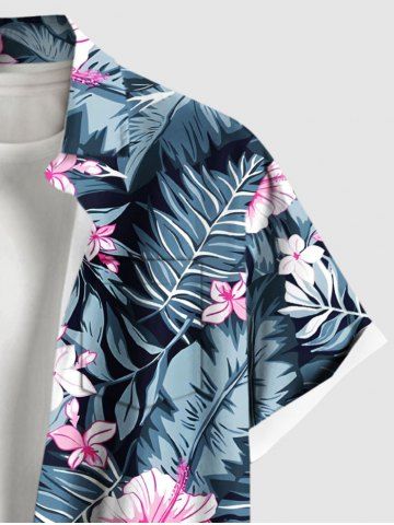 Plus Size Tropical Leaf Hibiscus Flower Print Buttons Pocket Hawaii Shirt For Men - Blue - 4xl