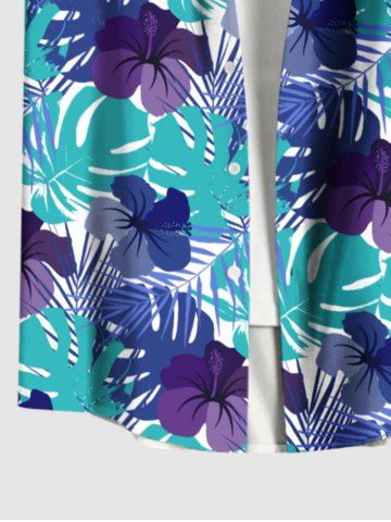 Plus Size Tropical Leaf Hibiscus Flower Print Buttons Pocket Hawaii Shirt For Men - Sky Blue - 3xl