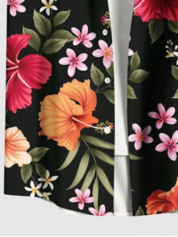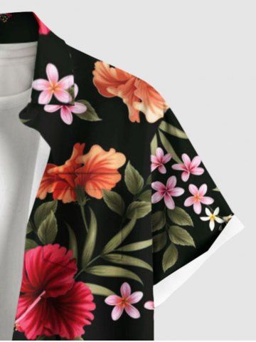 Plus Size Tropical Leaf Hibiscus Flower Print Hawaii Button Pocket Shirt For Men - Black - 3xl