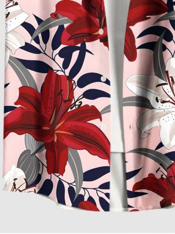 Plus Size Tropical Leaf Hibiscus Flower Print Hawaii Button Pocket Shirt For Men - Red - M