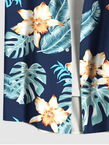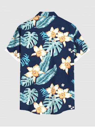 Plus Size Tropical Leaf Hibiscus Flower Print Hawaii Button Pocket Shirt For Men - Deep Blue - M