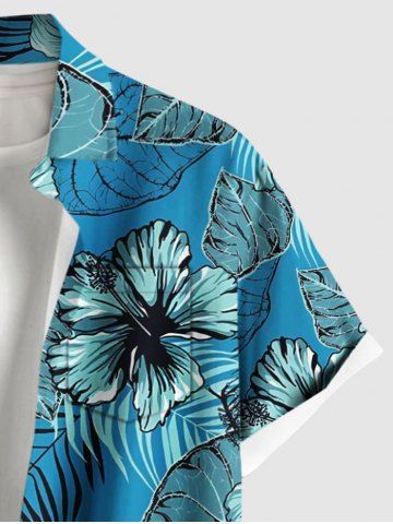Plus Size Tropical Leaf Hibiscus Flower Print Hawaii Button Pocket Shirt For Men - Blue - L