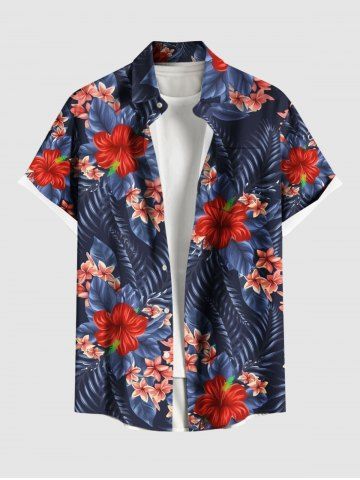Short Sleeves Shirts > Plus Size Tropical Leaf Hibiscus Flower Print Hawaii Button Pocket Shirt For Men