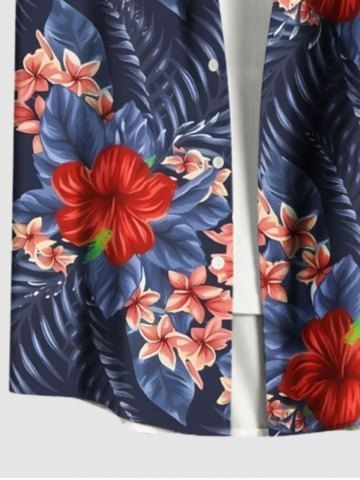 Short Sleeves Shirts > Plus Size Tropical Leaf Hibiscus Flower Print Hawaii Button Pocket Shirt For Men