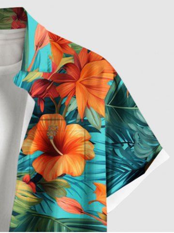 Short Sleeves Shirts > Plus Size Tropical Leaf Hibiscus Flower Print Hawaii Button Pocket Shirt For Men