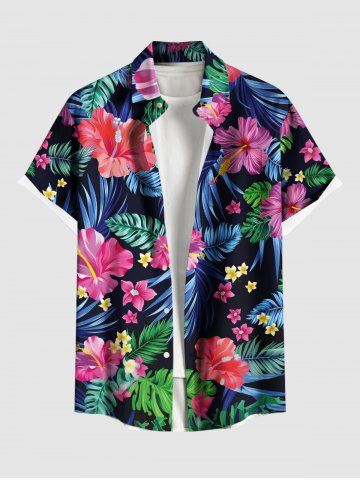 Short Sleeves Shirts > Plus Size Tropical Leaf Hibiscus Flower Print Hawaii Button Pocket Shirt For Men