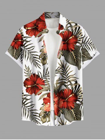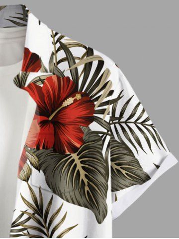Short Sleeves Shirts > Plus Size Tropical Leaf Hibiscus Flower Print Hawaii Button Pocket Shirt For Men