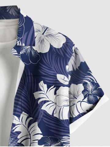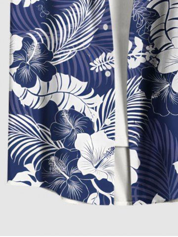 Plus Size Tropical Leaf Hibiscus Flower Print Hawaii Button Pocket Shirt For Men - Navy Blue - Xl