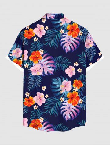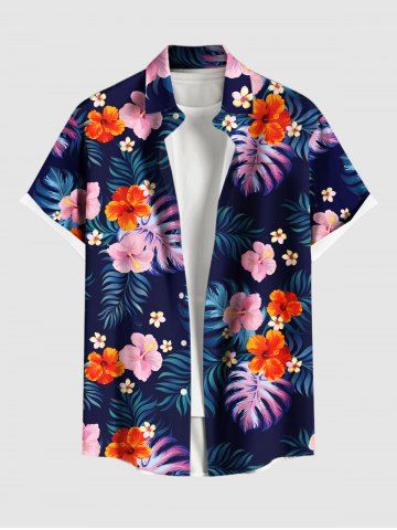 Plus Size Tropical Leaf Hibiscus Flower Print Hawaii Button Pocket Shirt For Men - Navy Blue - 4xl