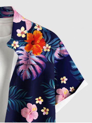 Plus Size Tropical Leaf Hibiscus Flower Print Hawaii Button Pocket Shirt For Men - Navy Blue - 5xl