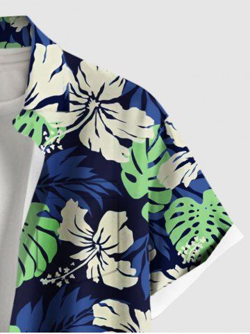 Short Sleeves Shirts > Plus Size Tropical Leaf Hibiscus Flower Print Hawaii Button Pocket Shirt For Men