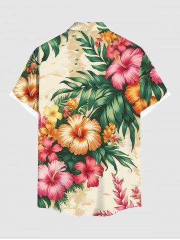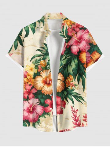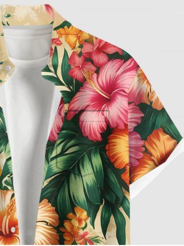 Short Sleeves Shirts > Plus Size Tropical Leaf Hibiscus Flower Print Hawaii Button Pocket Shirt For Men
