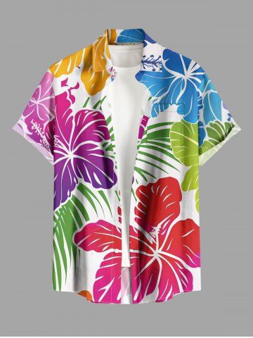Short Sleeves Shirts > Plus Size Tropical Leaf Hibiscus Flower Print Hawaii Button Pocket Shirt For Men