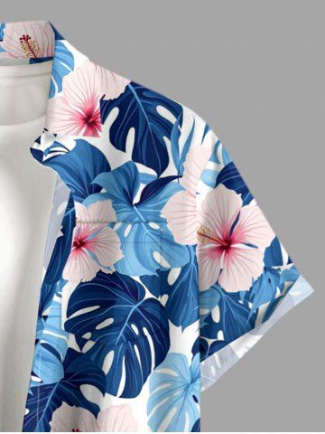 Short Sleeves Shirts > Plus Size Tropical Leaf Hibiscus Flower Print Hawaii Button Pocket Shirt For Men