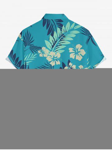 Plus Size Tropical Leaf Hibiscus Flower Print Hawaii Button Pocket Shirt For Men - Turquoise - M