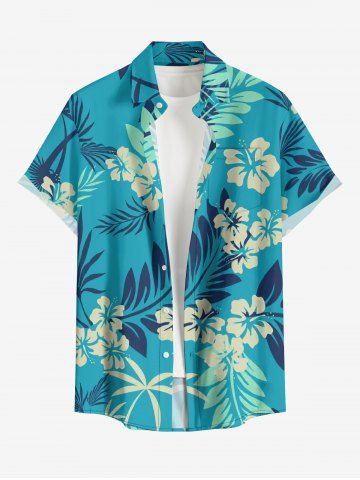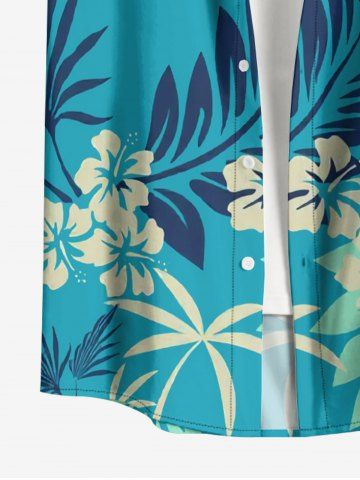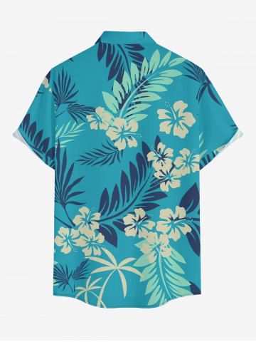 Plus Size Tropical Leaf Hibiscus Flower Print Hawaii Button Pocket Shirt For Men - Turquoise - 4xl
