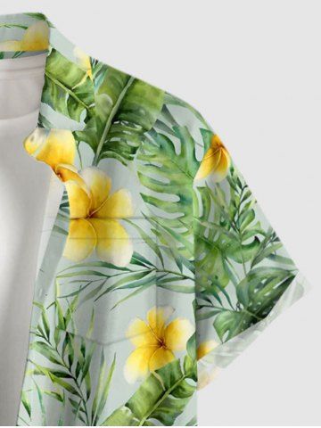 Plus Size Tropical Leaf Hibiscus Flower Print Hawaii Button Pocket Shirt For Men - Green - M