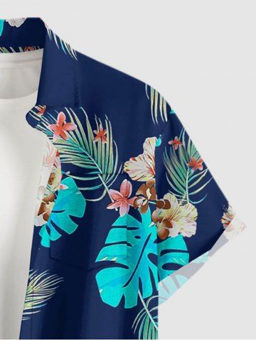 Plus Size Tropical Leaf Hibiscus Flower Print Hawaii Button Pocket Shirt For Men - Deep Blue - M