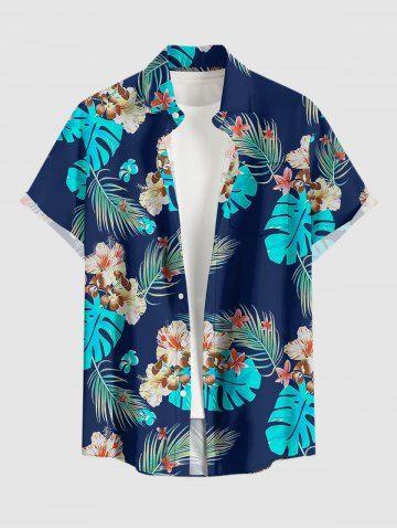 Plus Size Tropical Leaf Hibiscus Flower Print Hawaii Button Pocket Shirt For Men - Deep Blue - 3xl