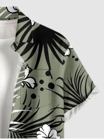 Plus Size Tropical Leaf Hibiscus Flower Print Hawaii Button Pocket Shirt For Men - Light Green - Xl