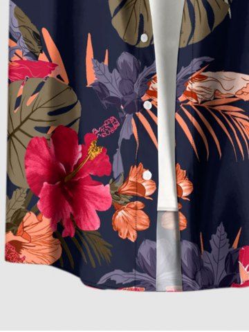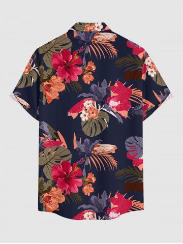 Plus Size Tropical Leaf Hibiscus Flower Print Hawaii Button Pocket Shirt For Men - Navy Blue - 2xl