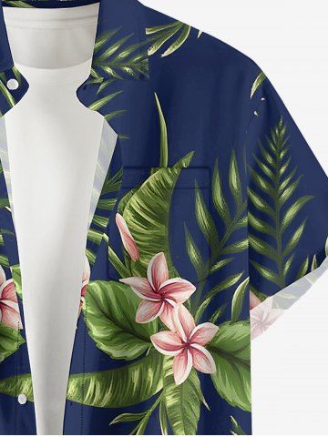 Plus Size Tropical Leaf Hibiscus Flower Print Hawaii Button Pocket Shirt For Men - Navy Blue - M