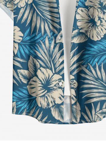 Plus Size Tropical Leaf Hibiscus Flower Print Hawaii Button Pocket Shirt For Men - Peacock Blue - S