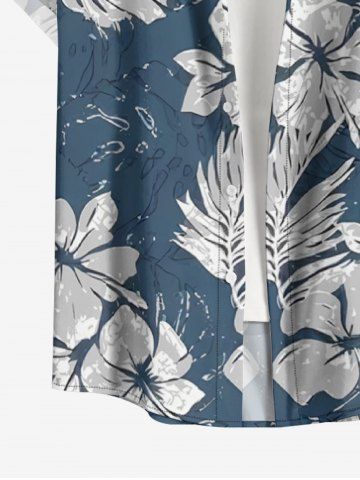 Plus Size Tropical Leaf Hibiscus Flower Print Hawaii Button Pocket Shirt For Men - Deep Blue - L