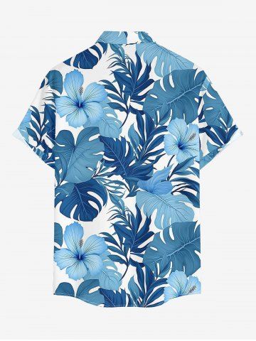 Plus Size Tropical Leaf Hibiscus Flower Print Hawaii Button Pocket Shirt For Men - Blue - S