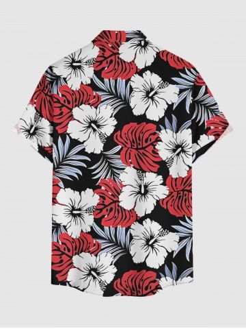 Plus Size Tropical Leaf Hibiscus Flower Print Hawaii Button Pocket Shirt For Men - Red - 3xl