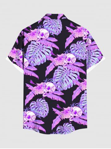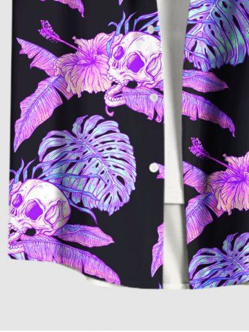 Plus Size Tropical Leaf Hibiscus Flower Skulls Print Buttons Pocket Hawaii Shirt For Men - Black - L