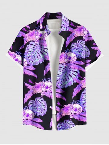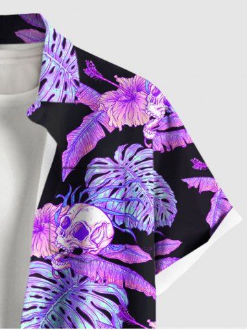 Plus Size Tropical Leaf Hibiscus Flower Skulls Print Buttons Pocket Hawaii Shirt For Men - Black - 6xl