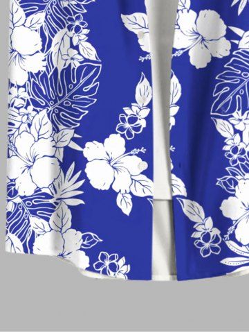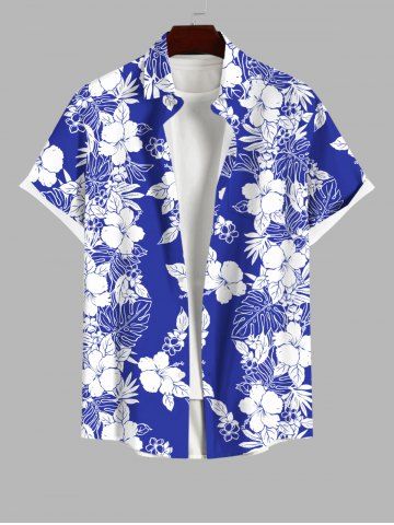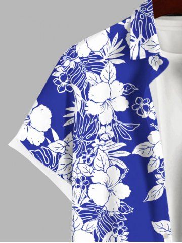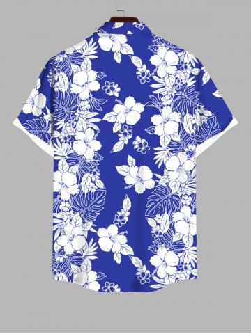 Plus Size Tropical Leaf Hibiscus Flower Two Tone Print Buttons Pocket Hawaii Shirt For Men - Blue - M
