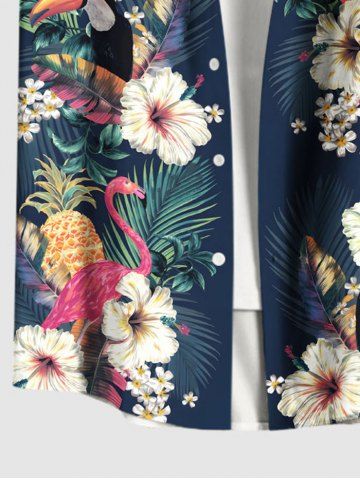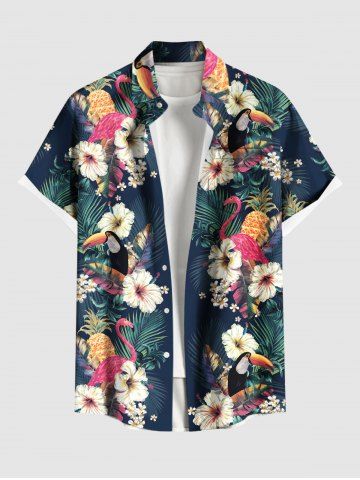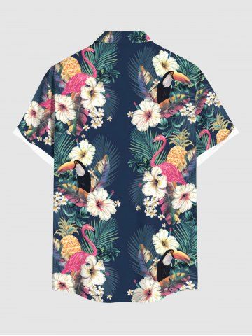 Plus Size Tropical Leaf Hibiscus Flowers Pineapple Flamingo Print Buttons Pocket Hawaii Shirt For Men - Deep Green - L