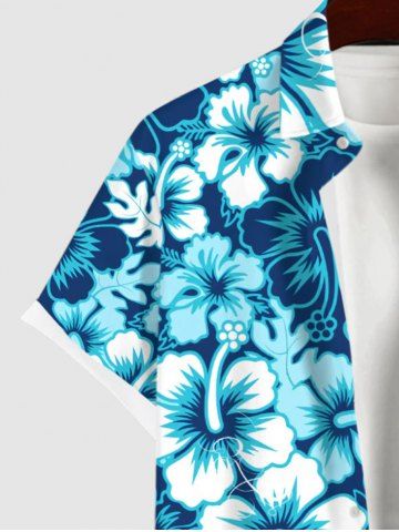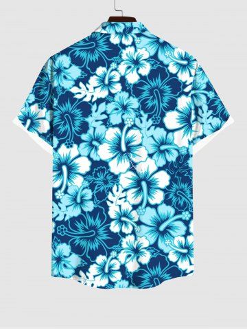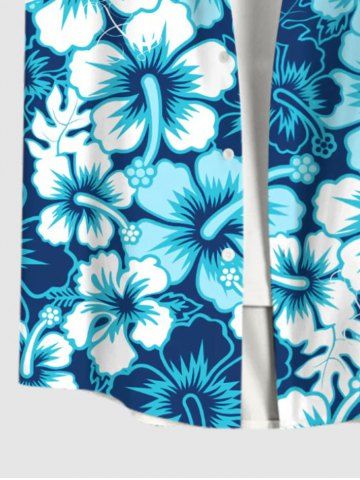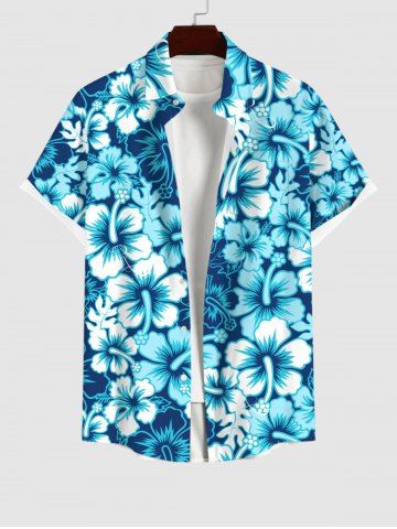 Plus Size Tropical Leaf Hibiscus Flowers Print Buttons Pocket Hawaii Shirt For Men - Blue - S