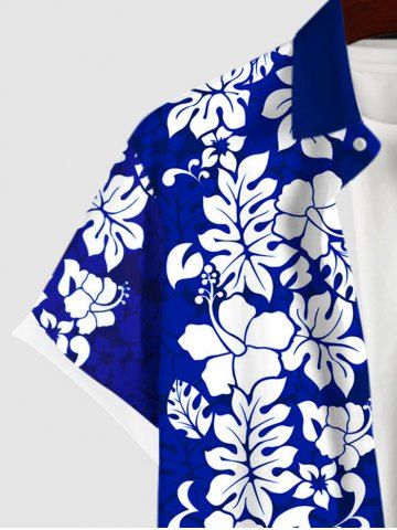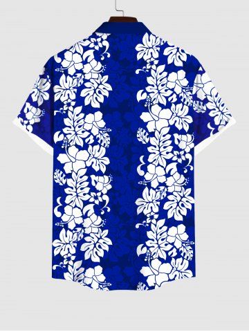 Plus Size Tropical Leaf Hibiscus Flowers Print Buttons Pocket Hawaii Shirt For Men - Blue - L