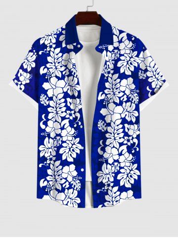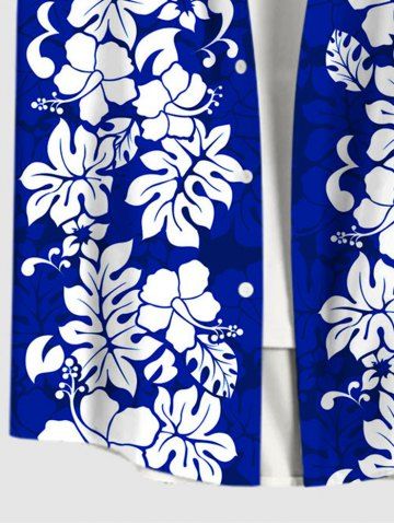 Plus Size Tropical Leaf Hibiscus Flowers Print Buttons Pocket Hawaii Shirt For Men - Blue - 4xl
