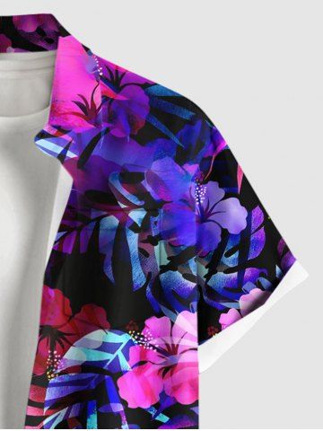 Plus Size Tropical Leaf Hibiscus Flowers Print Buttons Pocket Hawaii Shirt For Men - Purple - L