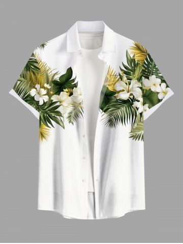 Plus Size Tropical Leaf Hibiscus Flowers Print Buttons Pocket Hawaii Shirt For Men - White - L