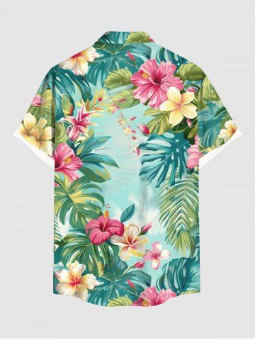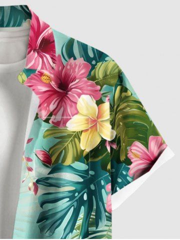 Plus Size Tropical Leaf Hibiscus Flowers Print Buttons Pocket Hawaii Shirt For Men - Green - M
