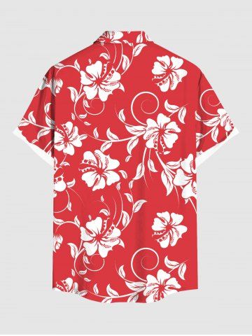 Plus Size Tropical Leaf Hibiscus Flowers Print Buttons Pocket Hawaii Shirt For Men - Red - 3xl