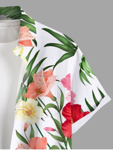 Plus Size Tropical Leaf Hibiscus Flowers Print Buttons Pocket Hawaii Shirt For Men - White - 4xl