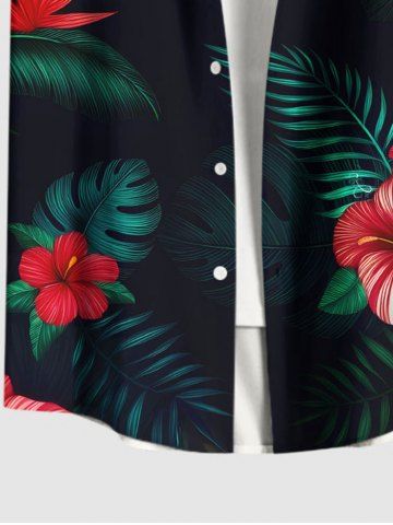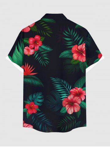 Plus Size Tropical Leaf Hibiscus Flowers Print Buttons Pocket Hawaii Shirt For Men - Black - L
