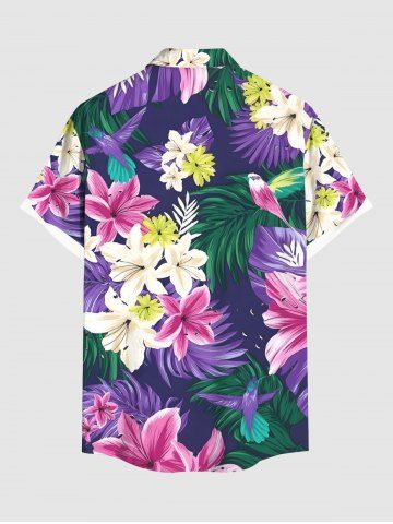Plus Size Tropical Leaf Lily Flower Bird Print Hawaii Button Pocket Shirt For Men - Purple - 3xl