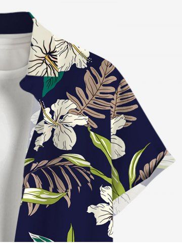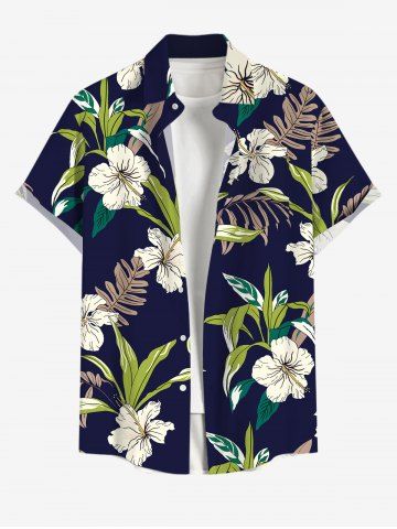 Short Sleeves Shirts > Plus Size Tropical Leaf Plant Hibiscus Flower Print Hawaii Button Pocket Shirt For Men