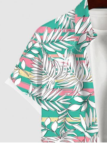 Plus Size Tropical Leaves Colorful Striped Print Hawaii Button Pocket Shirt For Men - Green - L